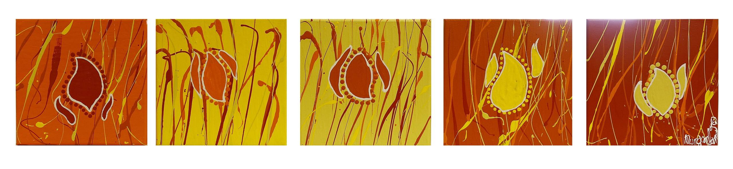 This series of 5 paintings can be framed together or separately and they fire up the imagination. I sat around the campfire most nights growing up in the bush and I loved the vitality, brilliant colours, and sparks that would come from the campfire. It not only warmed us on cold nights but was a heartwarming time to spend with family. It’s only for special occasions now but the high energy and glow of the campfire is so stimulating, and exciting.