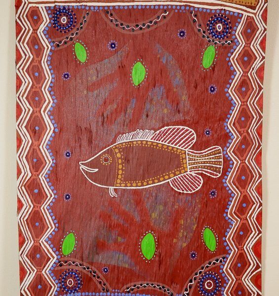 This acrylic on bark painting has a vibrant red ochre background with yellow ochre featuring on the top and bottom of the bark. The barramundi is centre piece surrounded by hands that would reach out and capture it. The blue dots represent the water and the green stylized leaves. This is my favourite fish to catch. It inhabits mangrove estuaries and freshwater streams. While it does not occur in the offshore waters of the Great Barrier Reef and Coral Sea, a look-alike called sand bass is found on the inner reefs of the Great Barrier Reef and on coastal reefs.