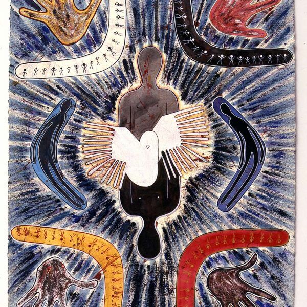 This painting describes me coming from a state of spiritual darkness into spiritual light. The boomerangs that I depict in the painting represent me throwing off my old self and my new self returning. The boomerangs in the four corners – white, black, yellow and red represent us reaching out to all the nations of the world. The dove of peace is in the centre.