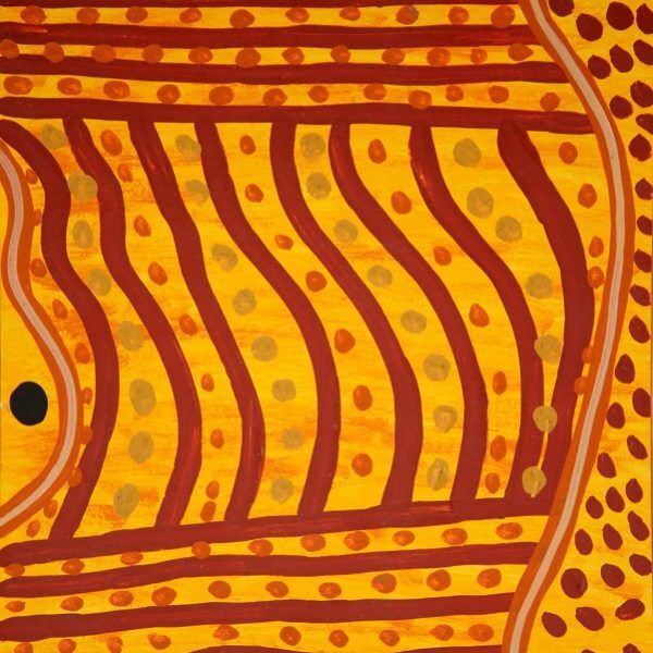 This series of three paintings was inspired by the gathering of tribes. The red and yellow ochre is symbolic of the earthy colour of the soil and brown and yellow leaves. Aboriginal people lived day to day in family groups. At times of ceremony, one to several hundred members of a single tribe came together. The largest ceremonies and gatherings consisted of different tribes meeting together when there might be over 1,000 people at one gathering. In Australia, tribes are really “language groups”, made up of people sharing the same language, customs, and lore or law. A tribe or