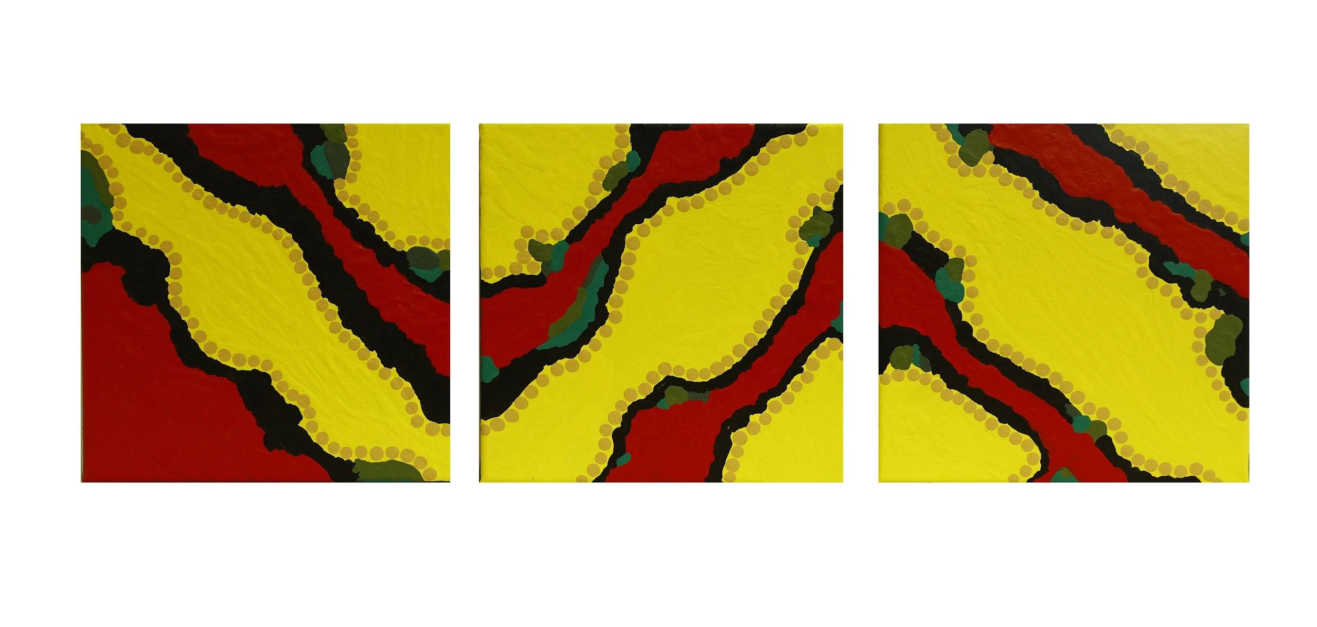 This set of 3 paintings depict my journey over the land as I walk on it barefoot feeling the earth beneath my feet shift slightly as I move over it. My connection to the land is so important to me and I have painted it stylistically it here. The red and yellow ochre are the natural colours my people were able use to paint with traditionally.
