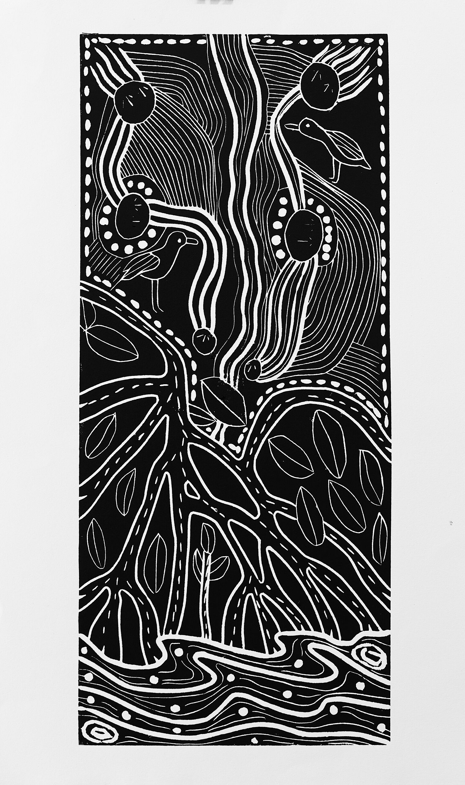 Seagulls live near the sea. They have short legs and long wings with white and grey feathers. You have likely encountered them and sometimes been annoyed by their scavenging. They are plentiful along the Cairns Esplanade, a favourite spot for birdwatchers. Mangroves are at the northern end and at the southern end of the Cairns Esplanade near the Cairns marina. Seagulls go searching in the mangroves for food. In the painting, you can see water channels in the top of the painting and the strong roots of the mangroves sitting in the sea.