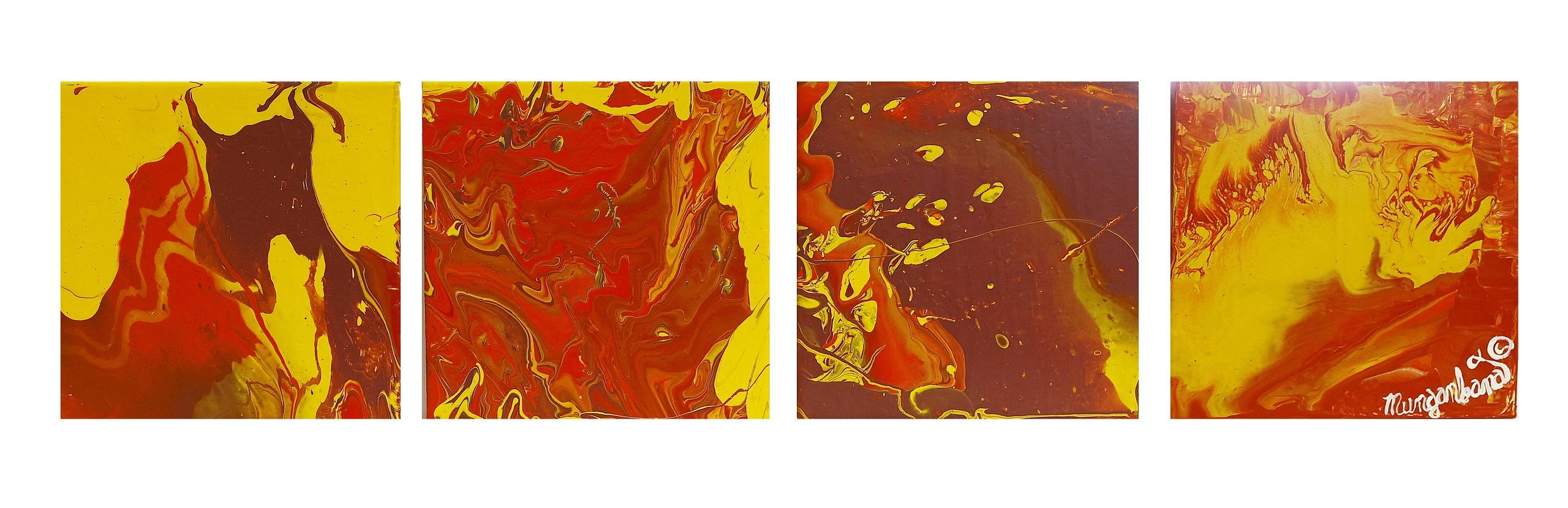 This set of 4 paintings is strikingly vibrant and brilliant. As I watch the sun rise, I am struck not only with its magnificence of colour in the reds, oranges, and yellows, but the swirl of movement as it changes shape over time. No sunrise is ever the same but we are welcomed to the day in a blaze of glory.