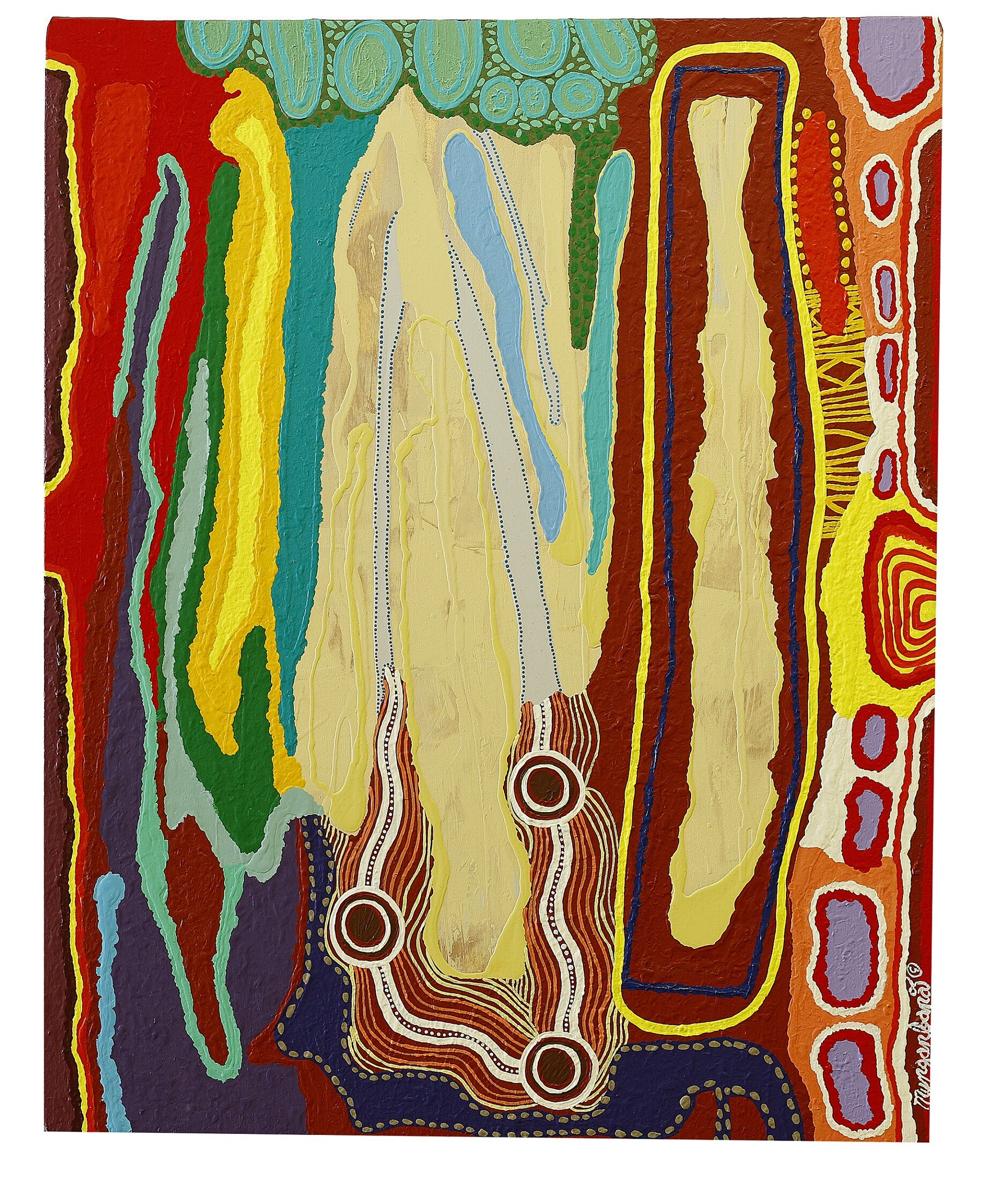 I love the Atherton Tablelands and I encourage people to visit it and enjoy the beautiful surroundings of mountains, lakes and waterfalls. This is an abstract painting showing patterns, and interesting designs inspired by the landscape. A canopy of trees converges to bring a covering over walkabout tracks. Ancient journeys from waterholes to waterholes are depicted. Shades of sunrise and sunset and their varying colours and interactions with the land inspire me and emerge from the painting.